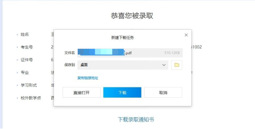 五、点击“下载”,录取通知书如下图所示,直接打印即可